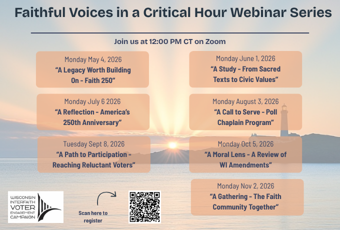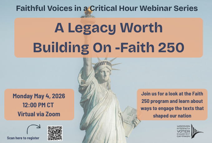 As we prepare for the midterm elections, the Wisconsin Interfaith Voter Engagement Campaign (WIVEC) is launching a monthly webinar series focused on civic and voter engagement from a faith-based perspective, called Faithful Voices in a Critical Hour. The series kicks off with A Legacy Worth Building On- Faith 250, an introduction to the Faith 250 program as we approach our nation’s 250th anniversary. The webinar will explore meaningful ways to engage the texts that have shaped our country, while encouraging reflection, connection, and shared civic renewal. Discover how communities can come together across differences to build relationships rooted in empathy, unity, and a deeper understanding of our shared story. We will also share ways to get involved with the program both in-person and virtually.